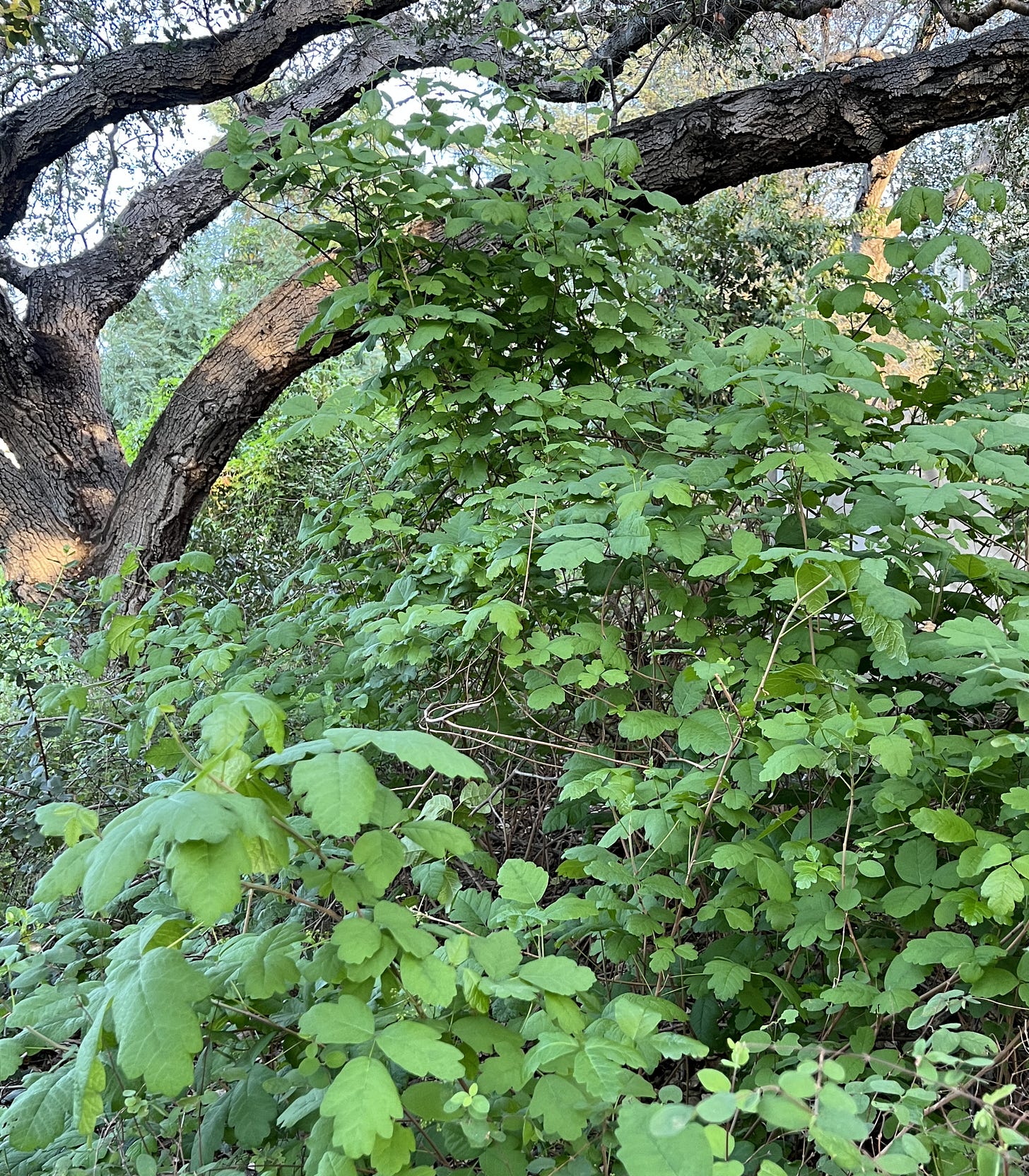 It appears to be true that removing exotic plants from under a mature oak canopy – especially weedy, European annual grasses – is one of the most effective things you can do to support the overall health of the tree. Likewise, selectively reintroducing native understory plants with whom your old oak was once familiar seems to have a similar effect and, in my experience, Poison Oak is perhaps the most therapeutic of all.