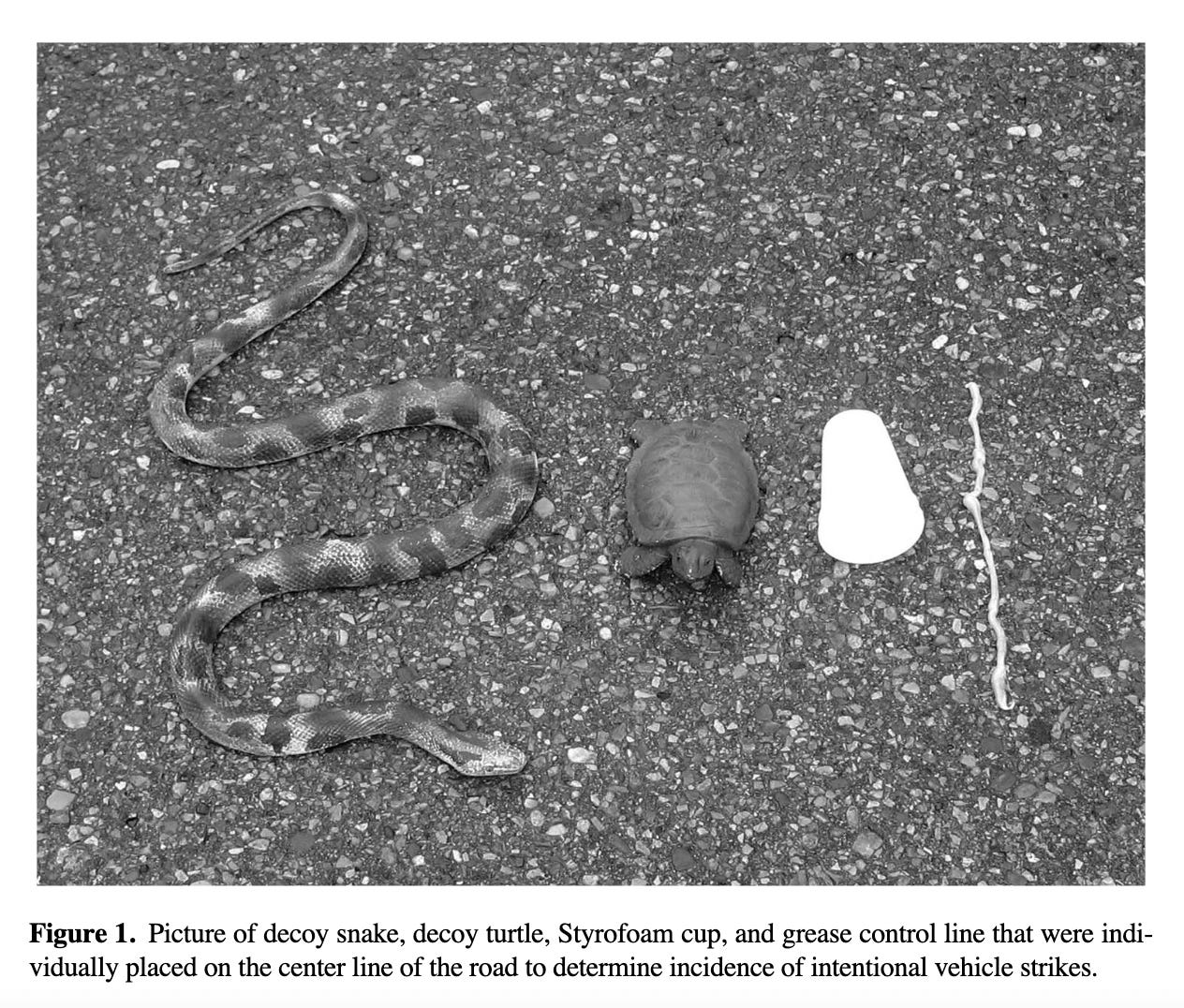 A 2007 study with the unintentionally hair-raising title, “Incidence of Intentional Vehicle-Reptile Collisions” examined — in the interest of local reptile species preservation — the supposition that people in the area were running over snakes crossing the road on purpose. In the study, a decoy rubber snake was placed on a road along with a faux turtle and, as a control, a Styrofoam cup. Guess which object drivers ran over the most? In fact, a significant number of drivers redirected their vehicles, even crossing the center line of the road, expressly to crush the hapless “snake” with their tires.