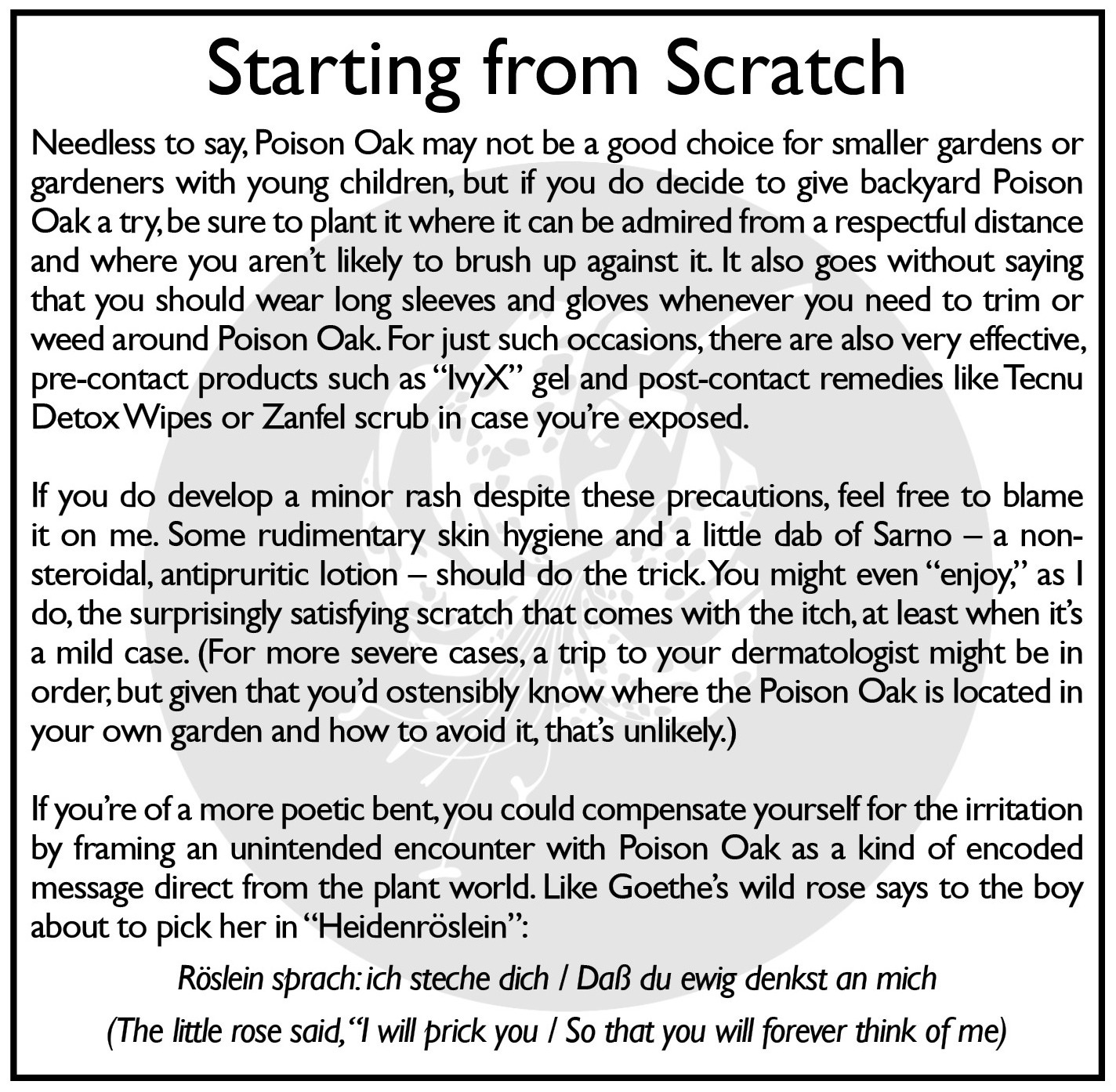 If, like me, you’re susceptible, Poison Oak’s resiny “poison,” called urushiol, goes to work instantly, as your skin’s contact with the leaves or stems of the plant trigger an allergic reaction. (In other words, the source of the rash is your body’s own immune system. Poison Oak is not, strictly speaking, poisonous.) This contact dermatitis can range from a minor irritation to a suppurating field of painful, fluid-filled blisters that can persist for weeks, appearing and popping open like little water balloons before they crust over and itch like hell.
